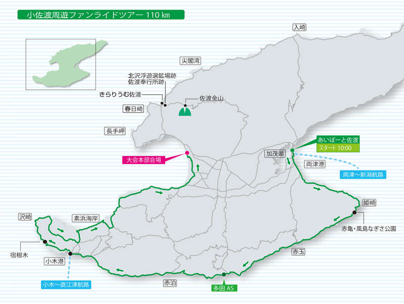 大会の前日(5月17日)に行われるこのファンライドは、佐渡の南側にあたる小佐渡を巡る110kmのコース(Aコースの後半部分)。1日で佐渡一周(サドイチ)210km走り切るAコースへの挑戦は難しいためBコースやCコースを選んだライダーも、このファンライドに参加すればサドイチを達成することができる。距離は長いが、このファンライドツアーでは参加者をグループ分けし、グループ毎にサポートライダーが付いてコースの誘導や先導を行うので、初・中級者でも安心して参加できる。