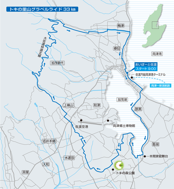 午前9時に両津地区にある「あいぽーと佐渡」をスタートし、路面の粗い加茂湖遊歩道を経由し、トキの森公園をめざす。トキの森公園で給水などの休憩を取ったあと、田植えの終わった田んぼの農道から大佐渡林道北線に向う。このエリアは野生のトキが多く生息していて、トキに会える確率が高いので周りをよく観察しながら慎重に走ろう。大佐渡林道北線は新緑に囲まれた林道で、何度もアップダウンを繰り返しなからのライドとなる。林道を含む33kmを走破し、正午の12時頃に「あいぽーと佐渡」に戻ってくる全行程3時間のスケジュール。